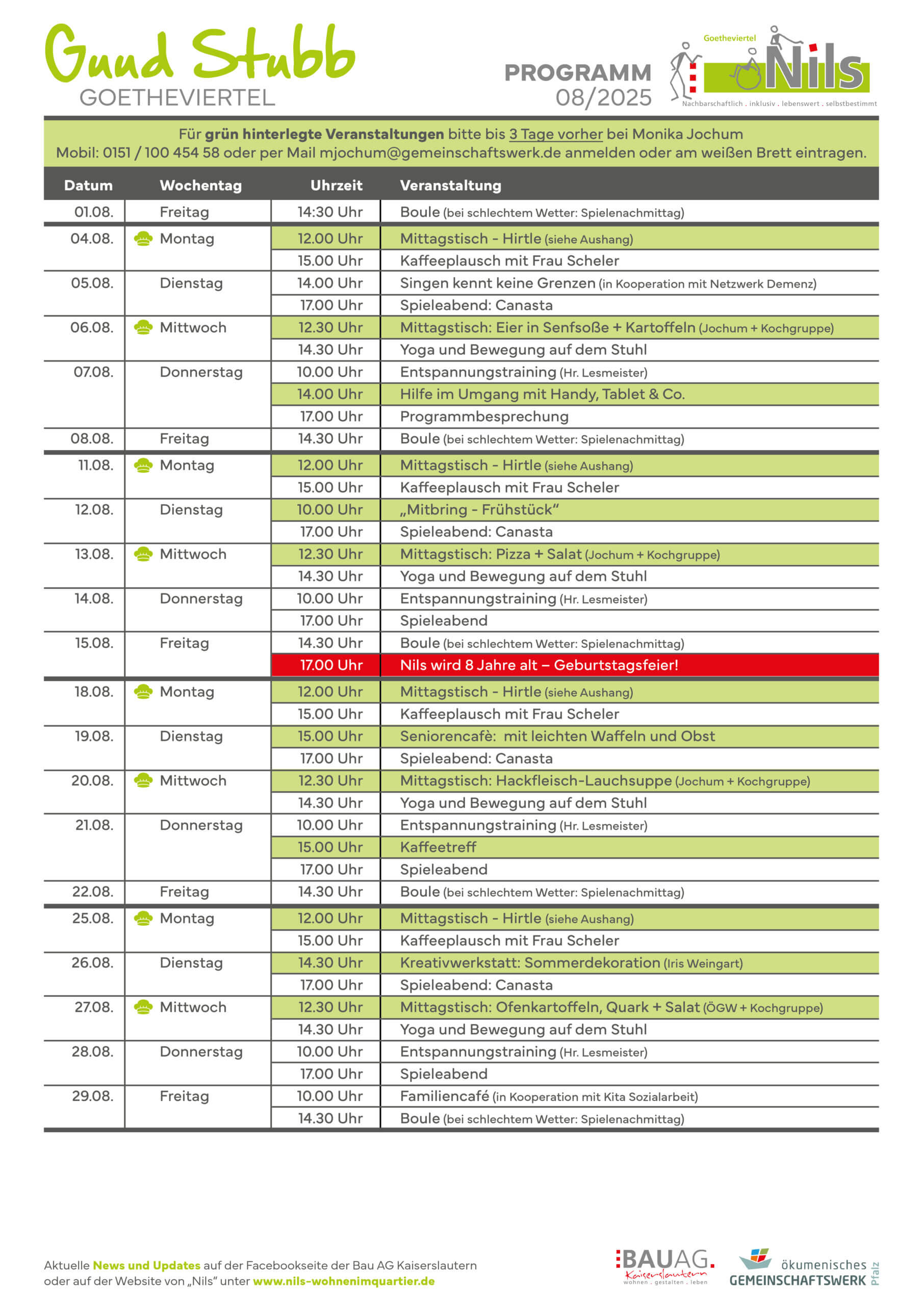 Das folgende abwechslungsreiche Programm findet in „Nils – Wohnen im Quartier“ Goetheviertel im September 2025 statt:
