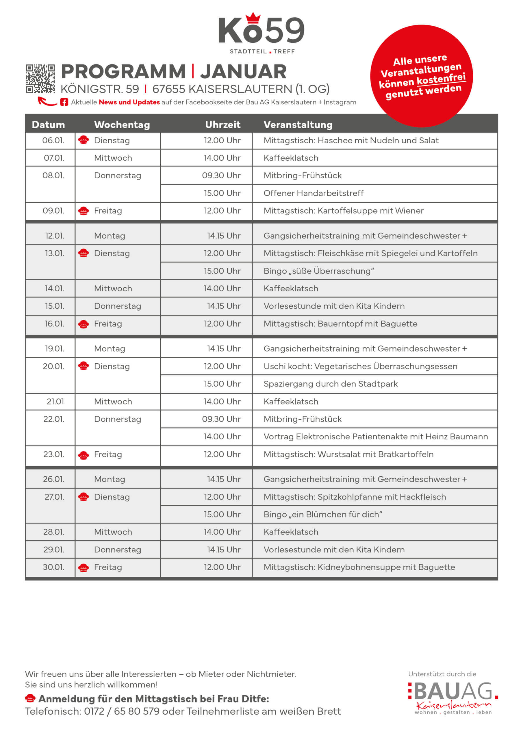 Der „Stadtteil-Treff KÖ 59“, in der Königstraße 59, hat so einiges zu bieten. Das erwartet Sie im Monat Januar 2026: